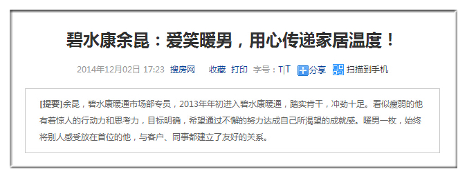 “碧水康是個很接地氣的品牌!”余昆說“冷得發(fā)慌,找碧水康!”的廣告詞很接地氣、很幽默,拉近了與客戶之間的距離,與*廣大的客戶群體打成一片,反映的不是表面,而是踏踏實實,深入人心,比較親善大眾。同時,公司輕松的氛圍,也讓大家開心地工作,無需拘泥于形式,一堆做實事的人聚到一起,向著同一個目標而奮斗!談及未來,余昆也是信心滿滿,也希望通過自己踏實的努力,能在2015年有新的突破!也會繼續(xù)豐富自己的專業(yè)知識,為新老客戶提供更多差異化、多元化的服務!